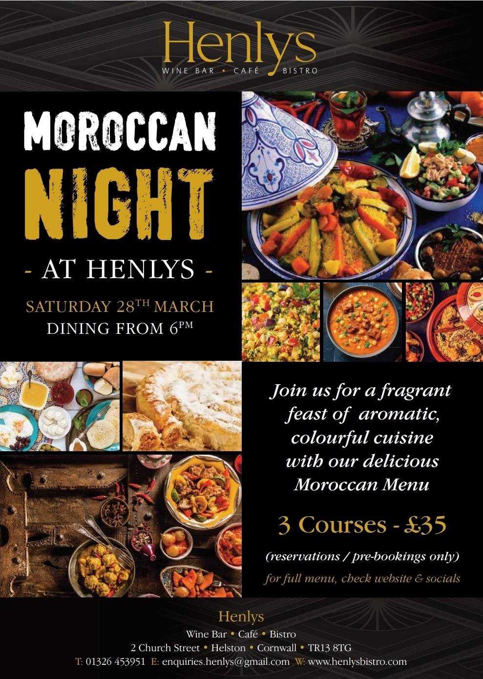 Henlys Wine Bar Cafe Bistro 2 Church St, Helston, Cornwall, United KingdomMoroccan Night at Henlys Saturday 28th March | Dining from 6pm Step into a world of fragrant spices, vibrant colours and rich Moroccan flavours for a special one-night dining experience at Henlys. Our chefs have created a...
