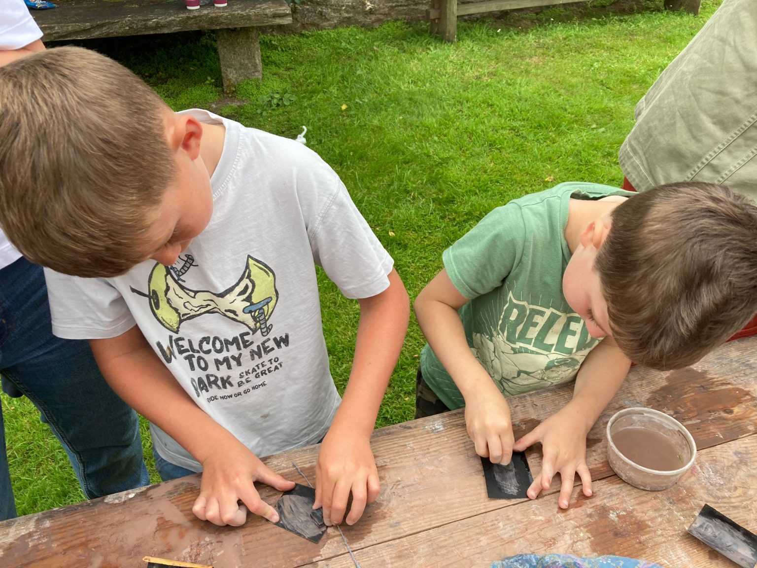 Paper making, serpentine polishing, woodworking, clay, tiny printing press, large vegetable printing.